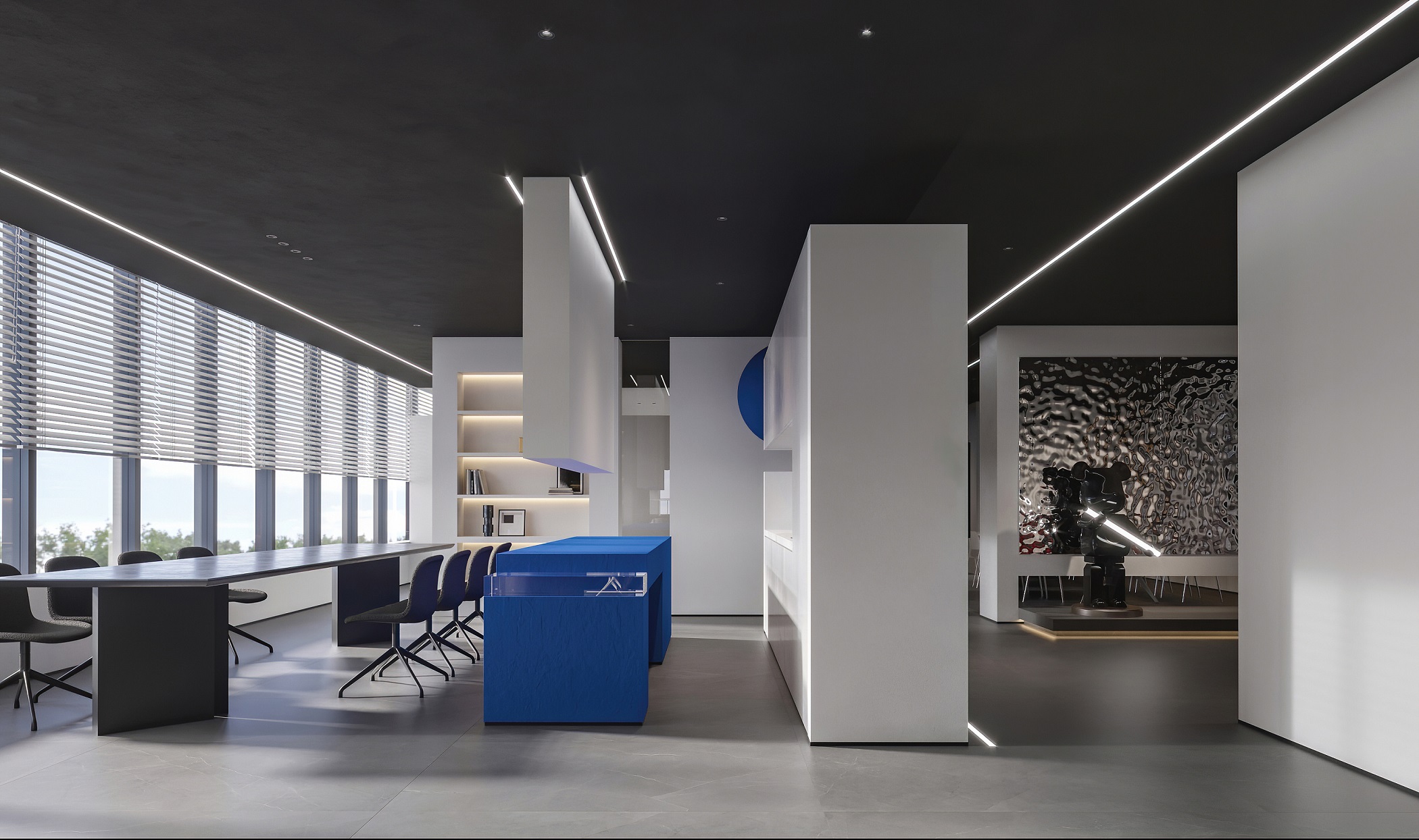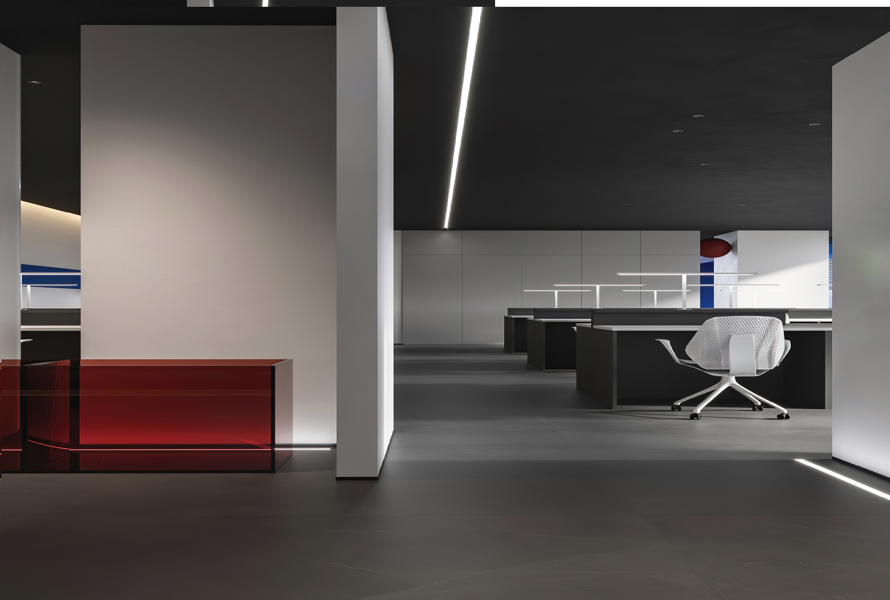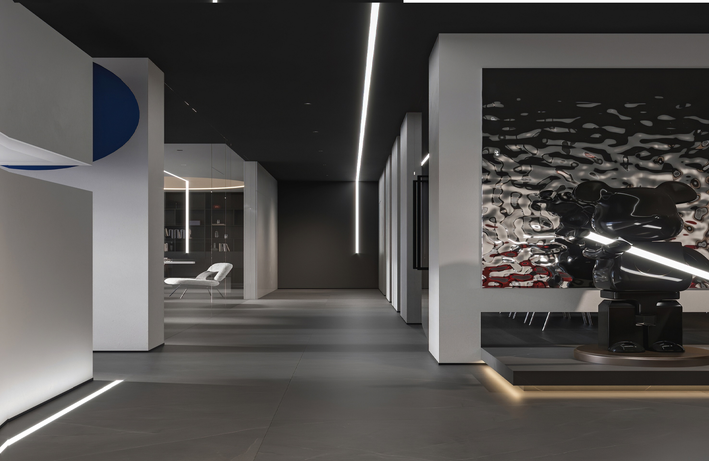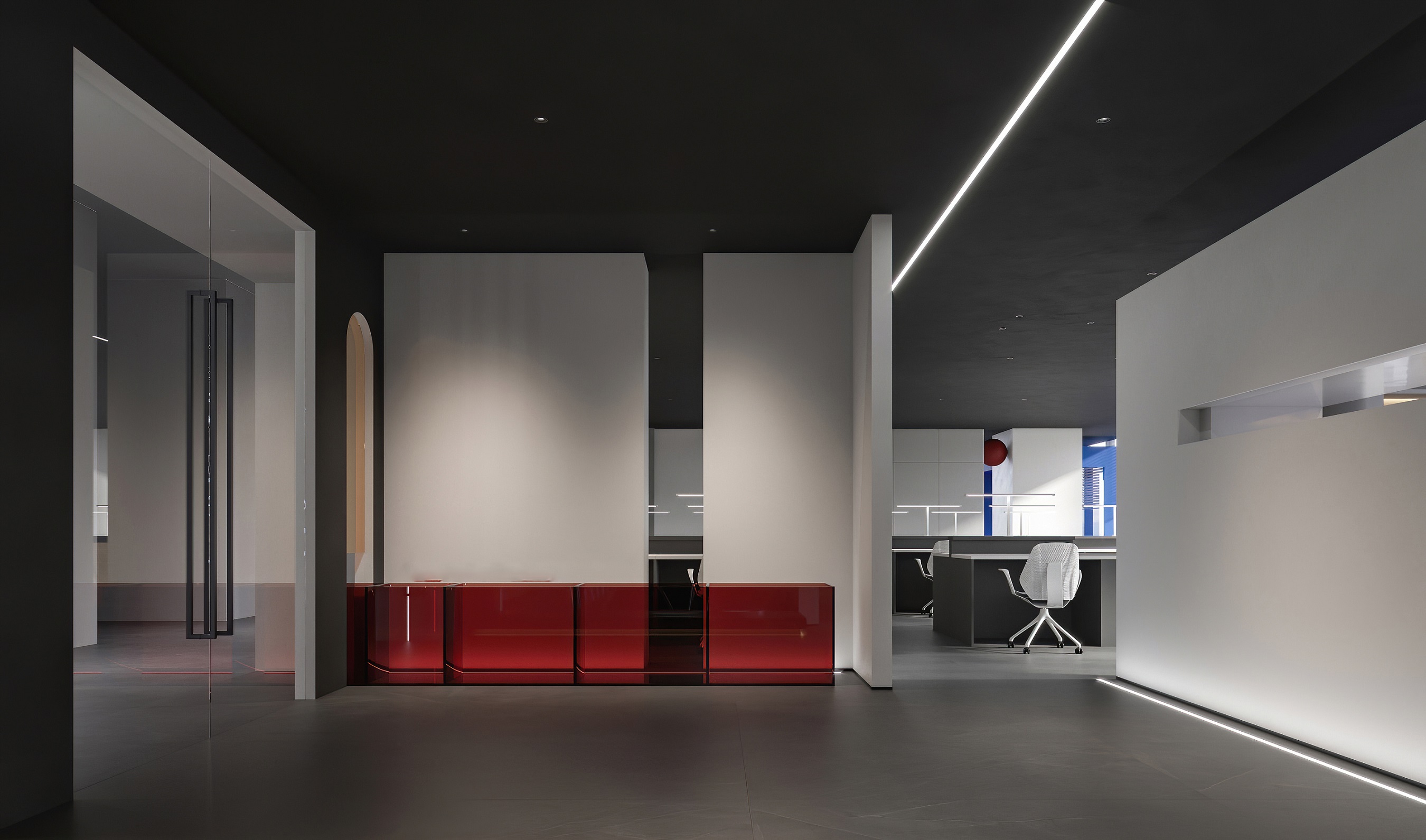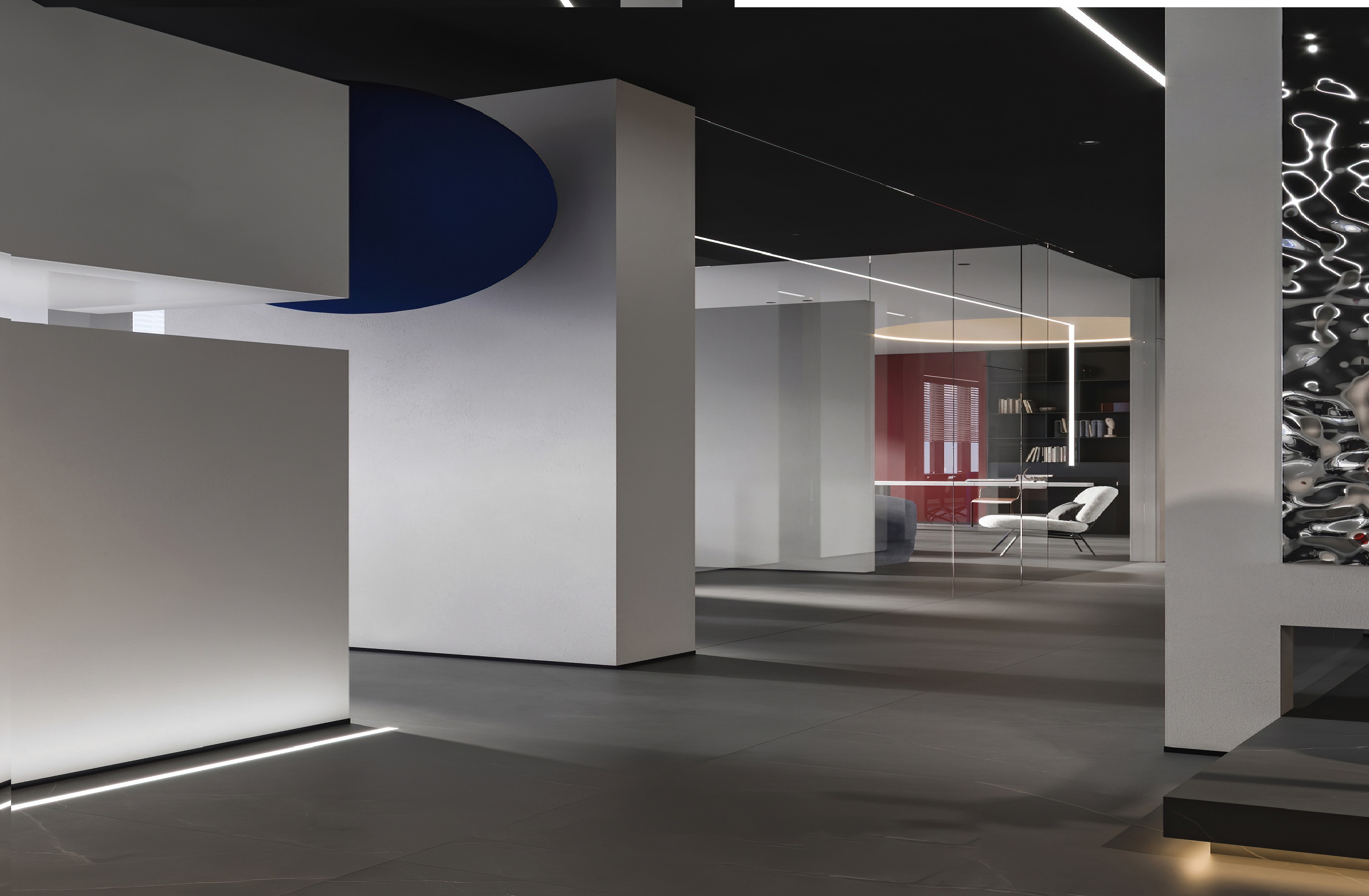 案例說明:本案圍繞其“靈透”,大量使用了玻璃、銀色系列及淺色調的潔凈材料,如玻璃幕墻、銀質鋁塑板、水晶白麻石材、玻化磚等,圍繞本案主題,構筑個性化空間,該色彩搭配除了清透、雅致、穩重、大氣之外,亦表現出一種力度感和效率感。滲透入貴機械制造企業之“清透感”,亦反襯企業之“柔美感”。以似乎矛盾的手法,又體現出古人之哲理“剛之極則柔,柔之極則剛”。老子說“上善若水”,該案則就其“善”滲透到每一個空間,極盡讓每個功能區都具有清透之靈性,盡顯靈動、清澈、時尚、大氣之空間氣韻。