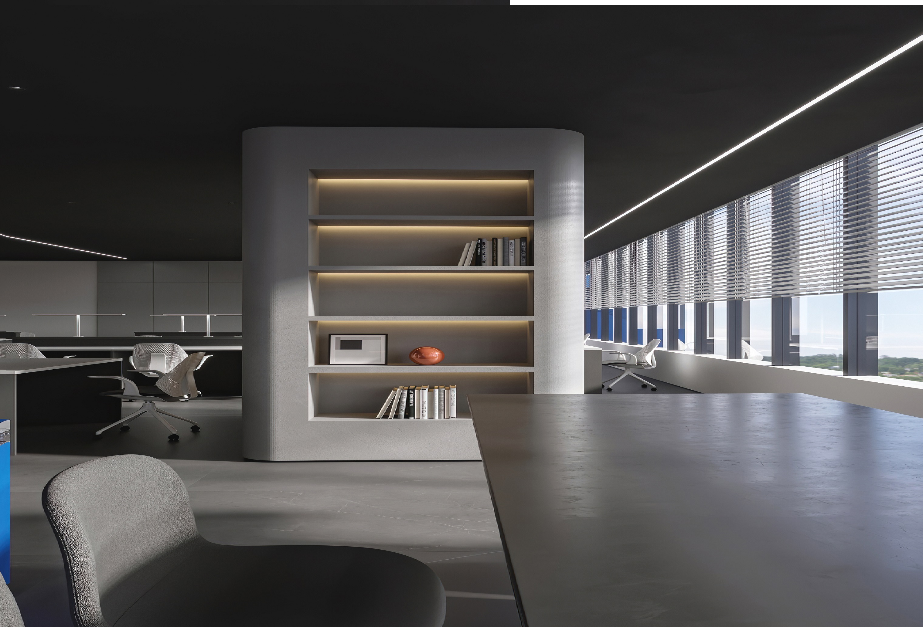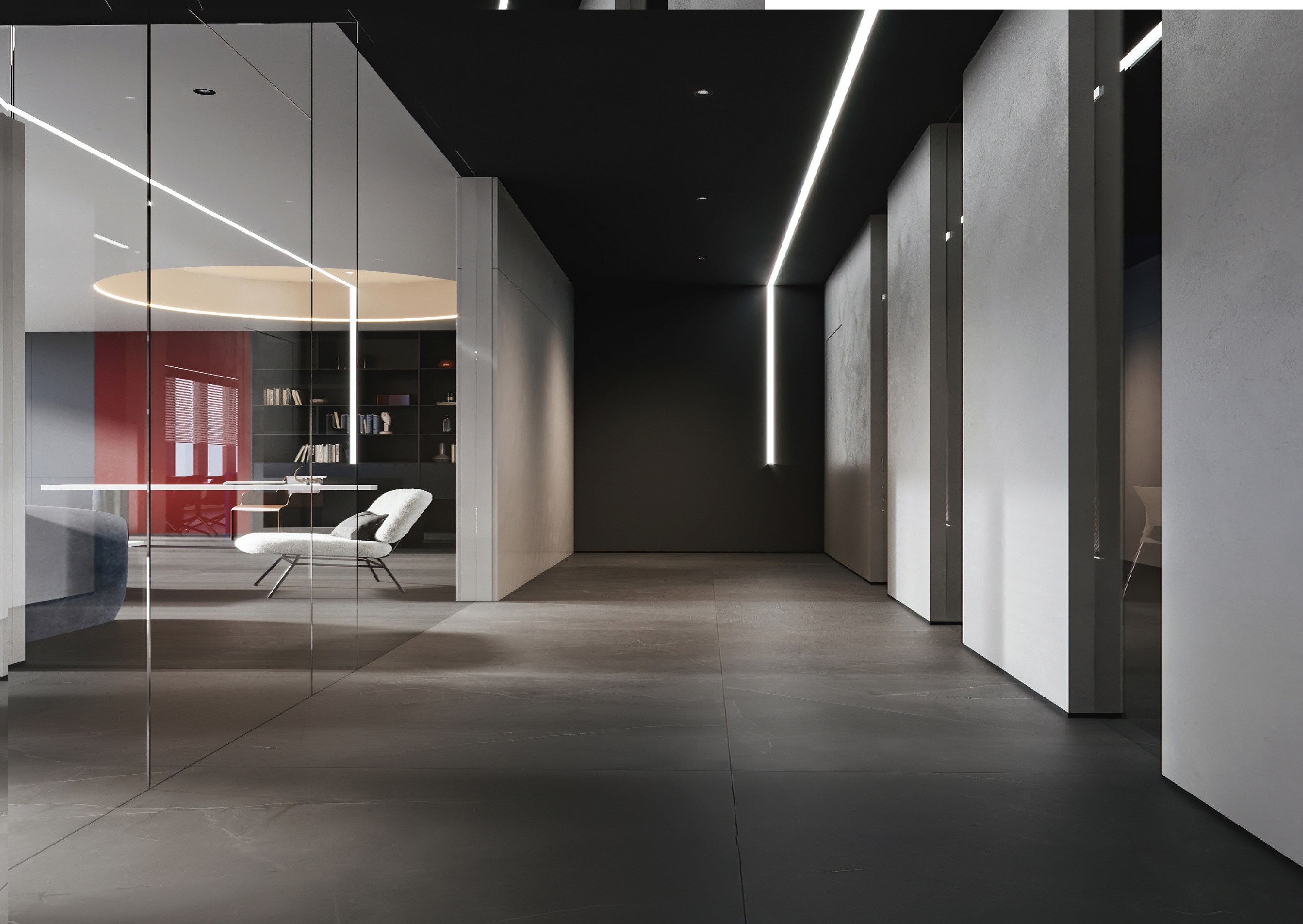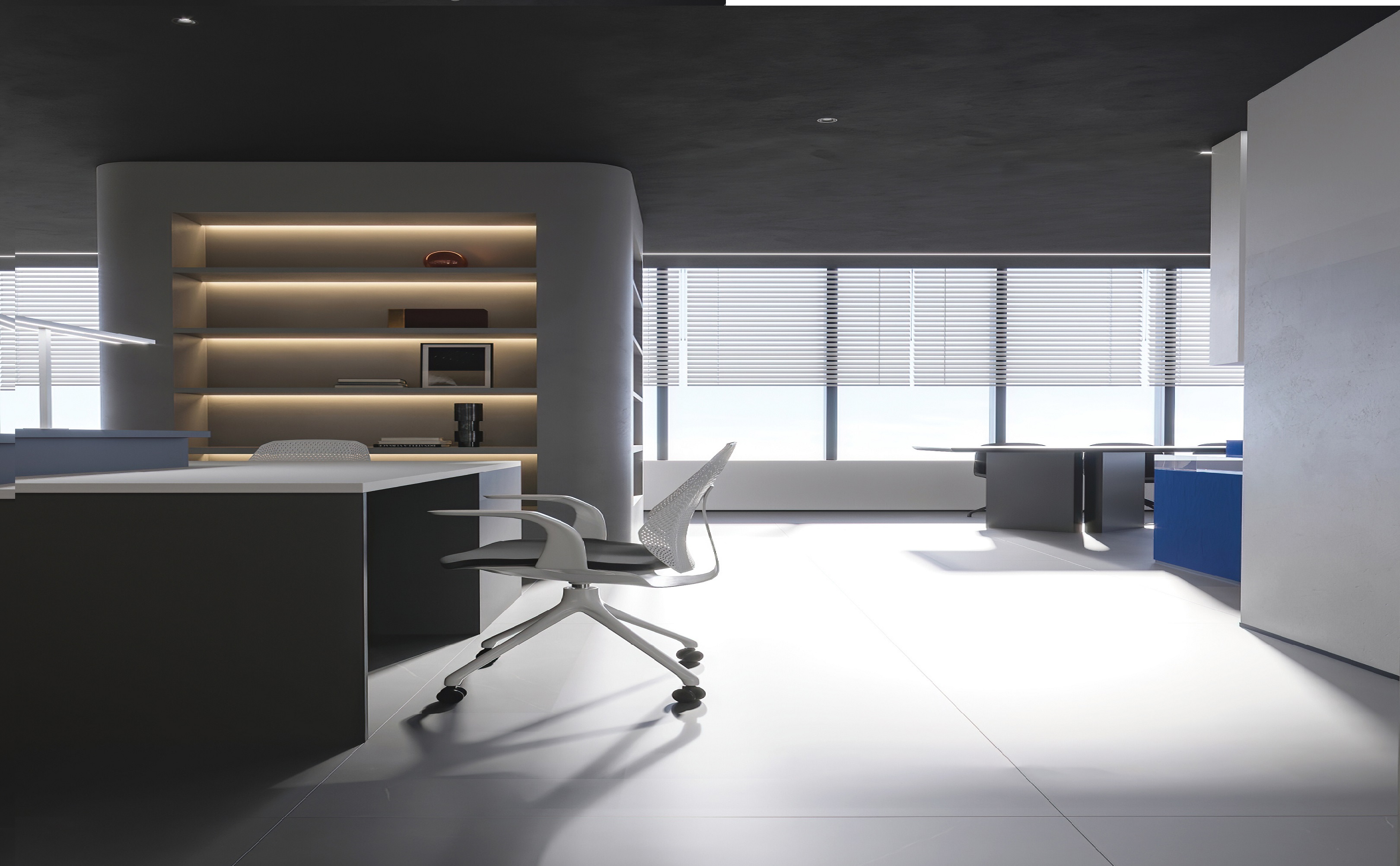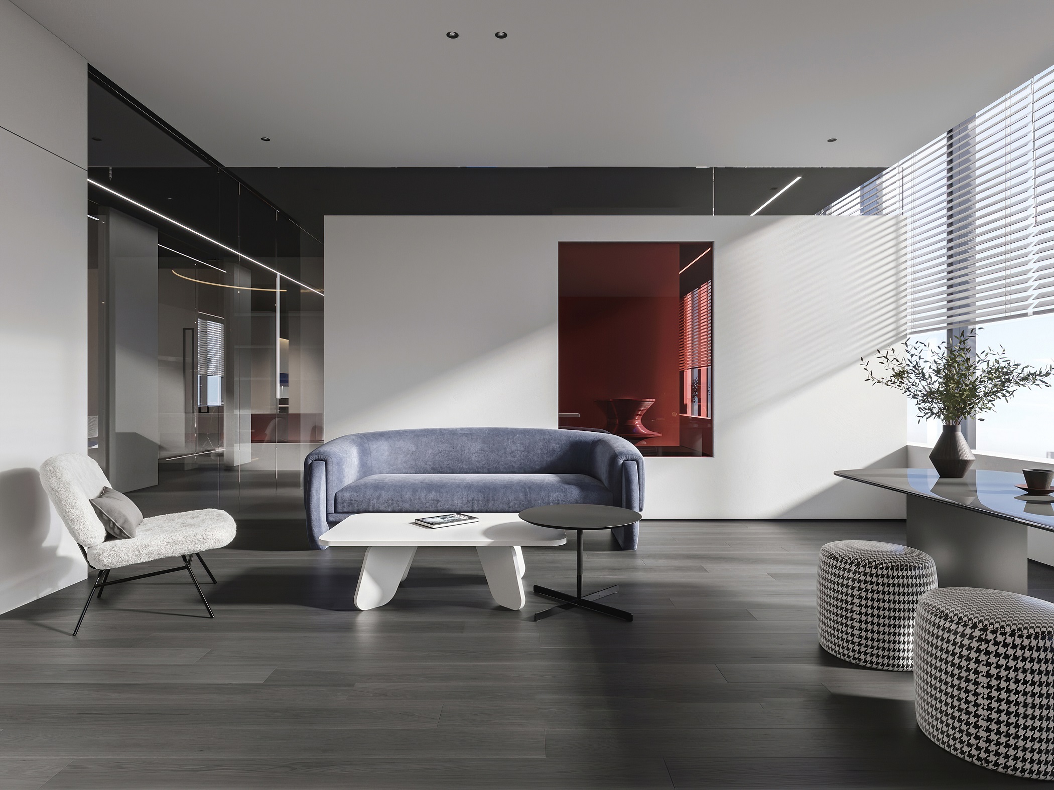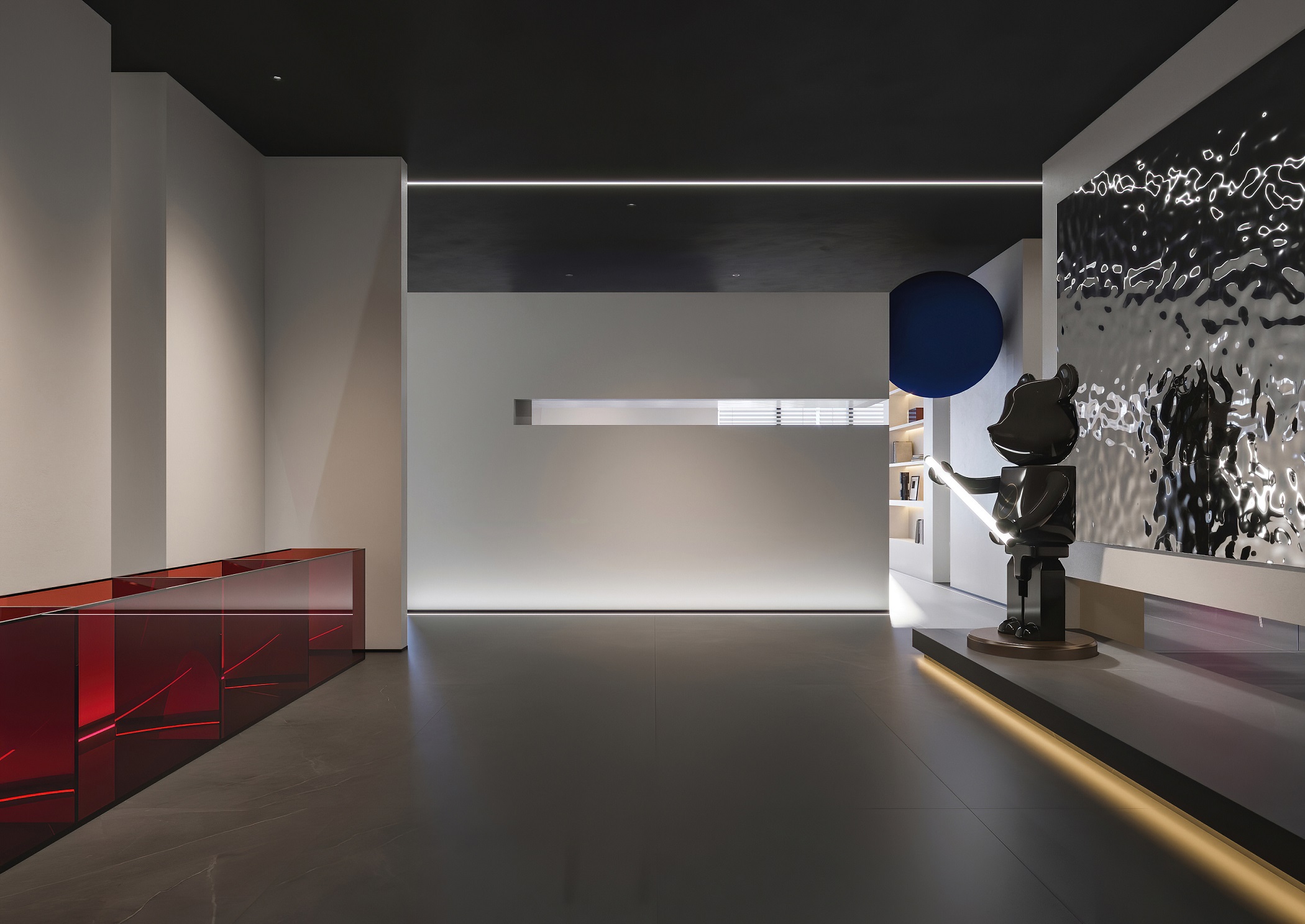 案例說明:本案圍繞其“靈透”,大量使用了玻璃、銀色系列及淺色調的潔凈材料,如玻璃幕墻、銀質鋁塑板、水晶白麻石材、玻化磚等,圍繞本案主題,構筑個性化空間,該色彩搭配除了清透、雅致、穩重、大氣之外,亦表現出一種力度感和效率感。滲透入貴機械制造企業之“清透感”,亦反襯企業之“柔美感”。以似乎矛盾的手法,又體現出古人之哲理“剛之極則柔,柔之極則剛”。老子說“上善若水”,該案則就其“善”滲透到每一個空間,極盡讓每個功能區都具有清透之靈性,盡顯靈動、清澈、時尚、大氣之空間氣韻。