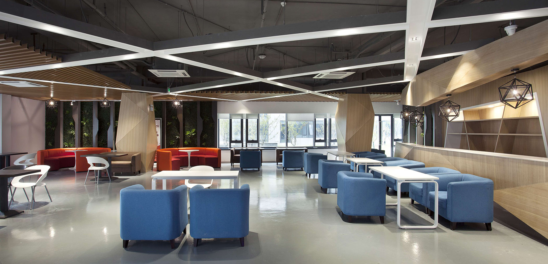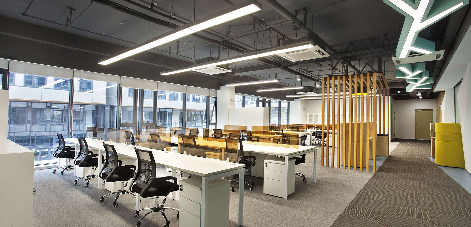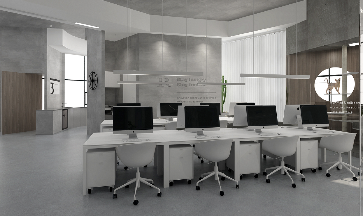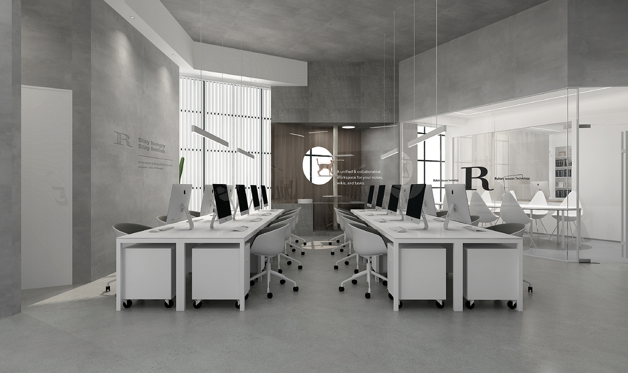 案例說明: 本案采用開放式辦公,傳統的辦公室是一種封閉式的辦公室,這種辦公室由一系列小辦公室組成,每間小辦公室只有少數職員,辦公工作在各間小辦公室里執行,小辦公室通過回廊連接。在封閉式設計下,各種工作互不干擾并能形成一種緊密的工作群體。但對于本公司來說,這種設計方法帶來了溝通上的困難,而且不利于建立標準化的工作程序,也不利于全面管理。