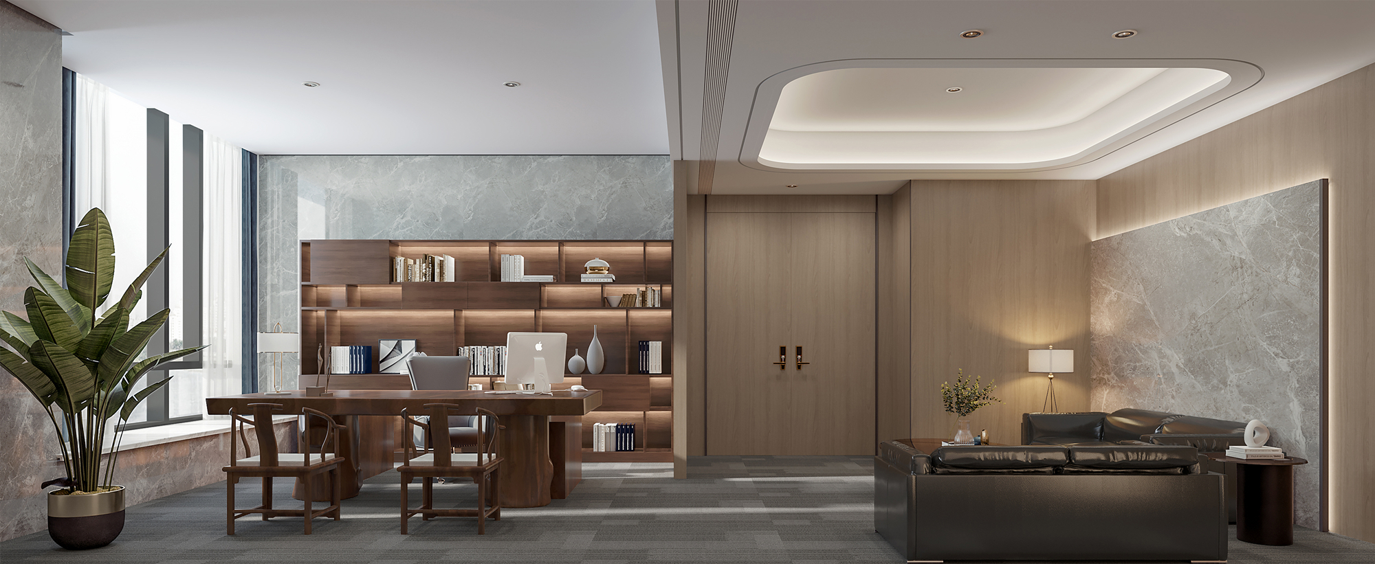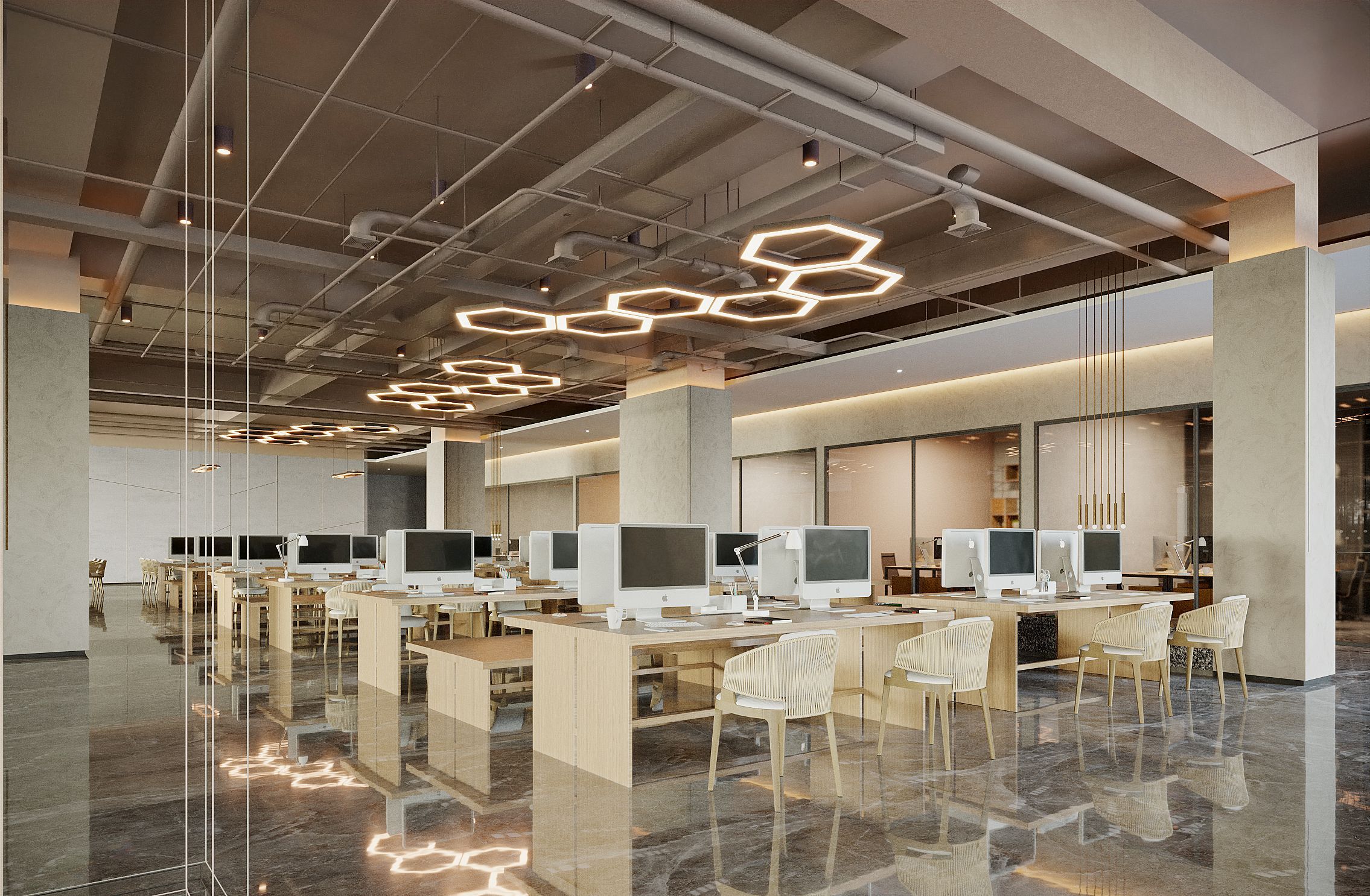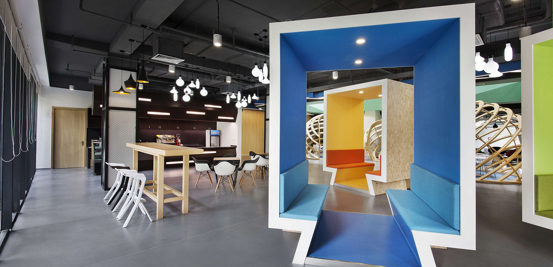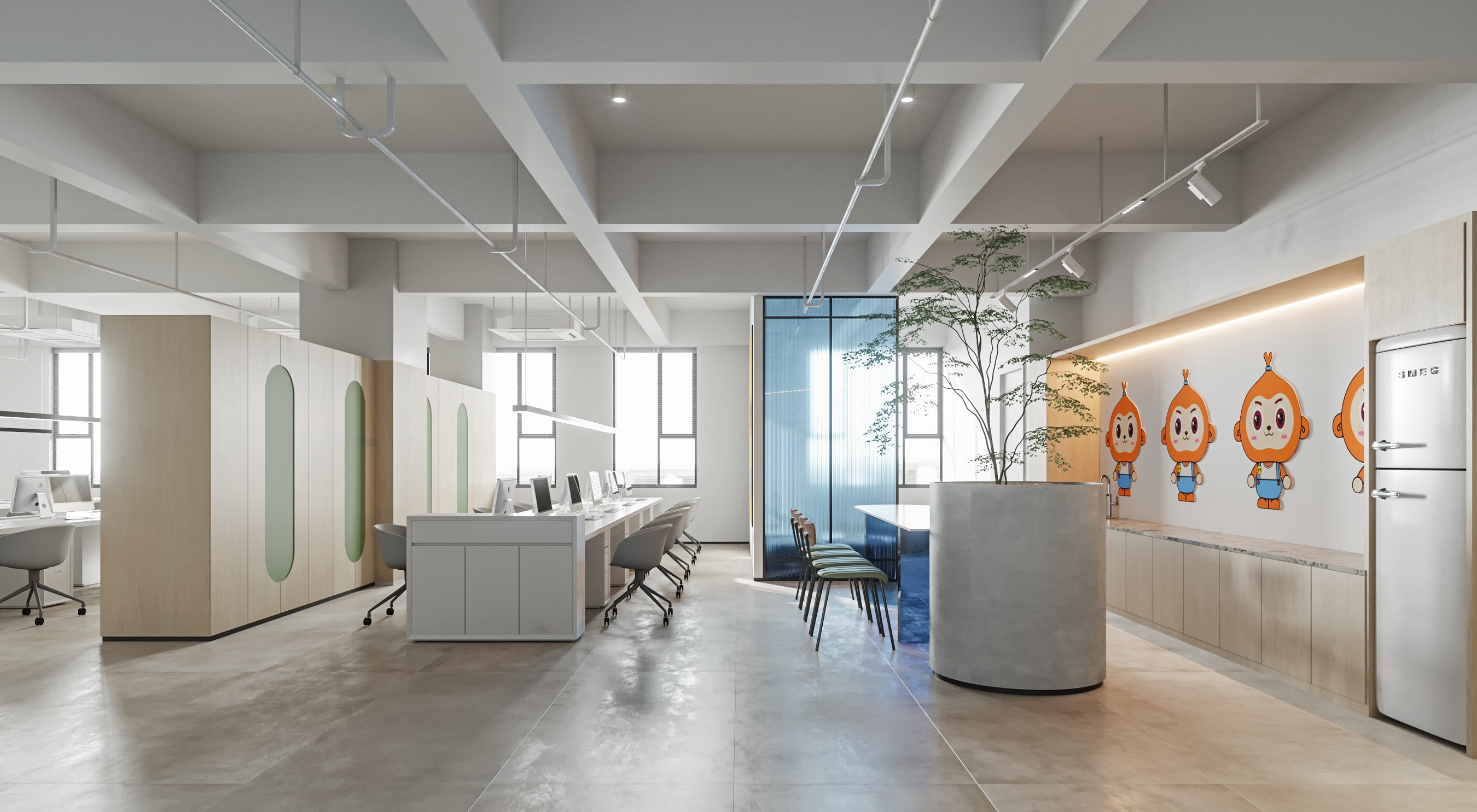 案例說明: 本案采用開放式辦公,傳統的辦公室是一種封閉式的辦公室,這種辦公室由一系列小辦公室組成,每間小辦公室只有少數職員,辦公工作在各間小辦公室里執行,小辦公室通過回廊連接。在封閉式設計下,各種工作互不干擾并能形成一種緊密的工作群體。但對于本公司來說,這種設計方法帶來了溝通上的困難,而且不利于建立標準化的工作程序,也不利于全面管理。