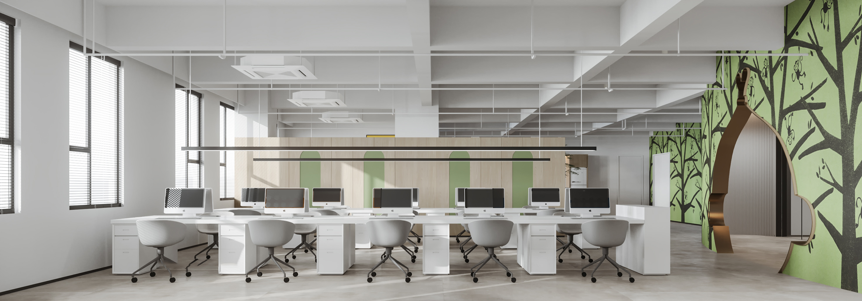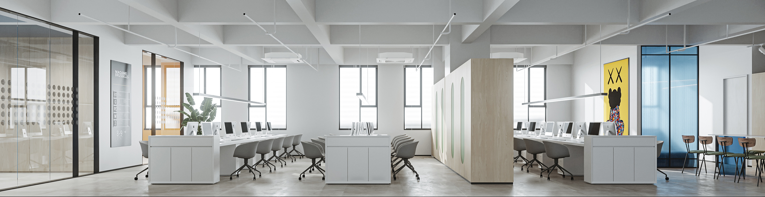 開放式辦公室由一塊大而連續的空間組成。在這個空間里有許多不同的部門,相互之間完全沒有隔墻。辦公桌和其他辦公家具、辦公設備應排列整齊,并盡可能朝著同一方向。開放式辦公室相對于封閉式辦公室來說有極大的優勢。